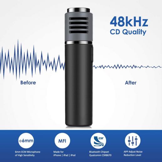 Профессиональная сертифицированная MFI беспроводная петличная микрофонная система, встроенный высокочувствительный микрофон ECM диаметром 6 мм, набор микросхем Bluetooth Qualcomm, интеллектуальный алгоритм SWISS и дополнительное приложение Smartmike+, которые работают вместе для снижения уровня шума.