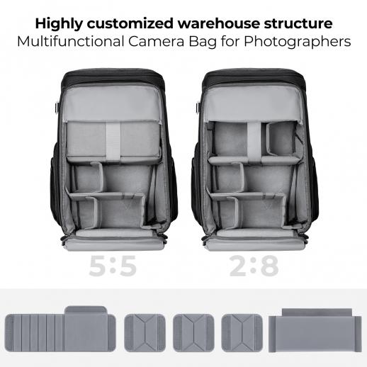 - * 【Дизайн Magic Bin】 Этот рюкзак для фотосъемки может быть реализован в формате 5: 5 и 2: 8, нажимая вверх или вниз для различных нужд. Подходит для уличной фотографии, городской уличной фотографии, портретной съемки на открытом воздухе, фотографии VIOG и т. д.