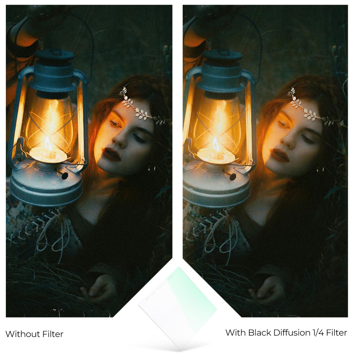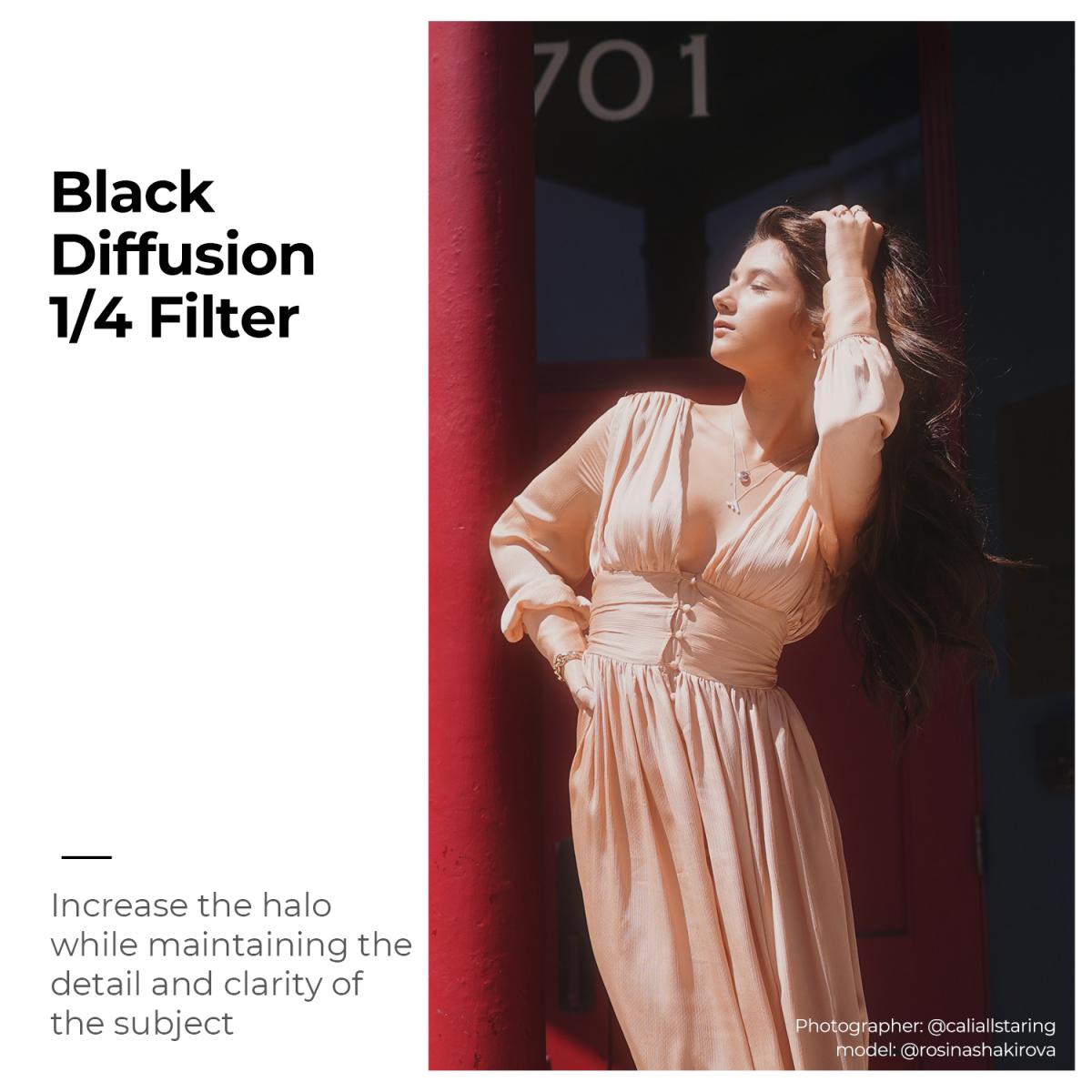 - * 【Создает кинематографический эффект мечты】Этот черный диффузионный фильтр с эффектом 1/4 может смягчить морщины, веснушки и поры кожи лица, сделав ее более нежной, пухлой и великолепной. Эффект туманной пленки можно лучше реализовать, показывая мечтательный эффект. Рекомендуем использовать его в видеосъемке и портретной фотографии.