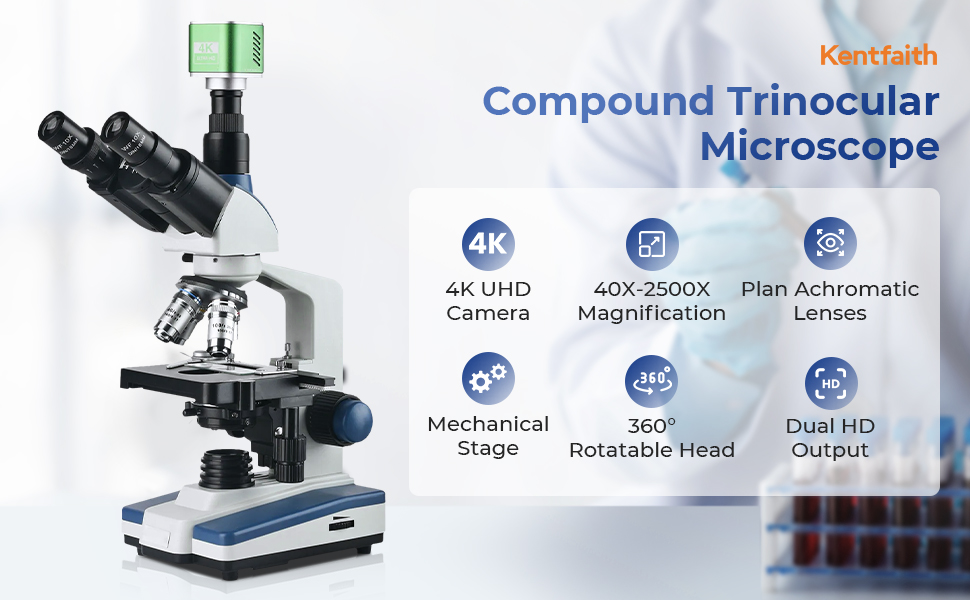 Составной микроскоп с камерой 4K, увеличением 40X-2500X, подключением к ПК, планарной оптической системой, механическим предметным столиком, Kentfaith