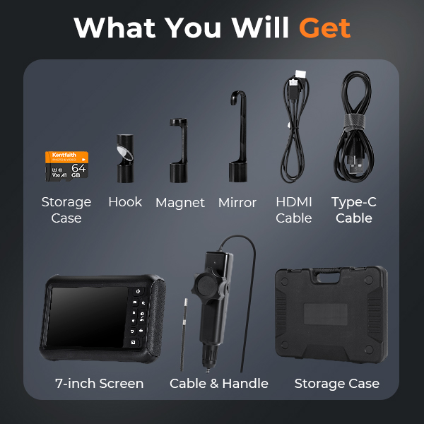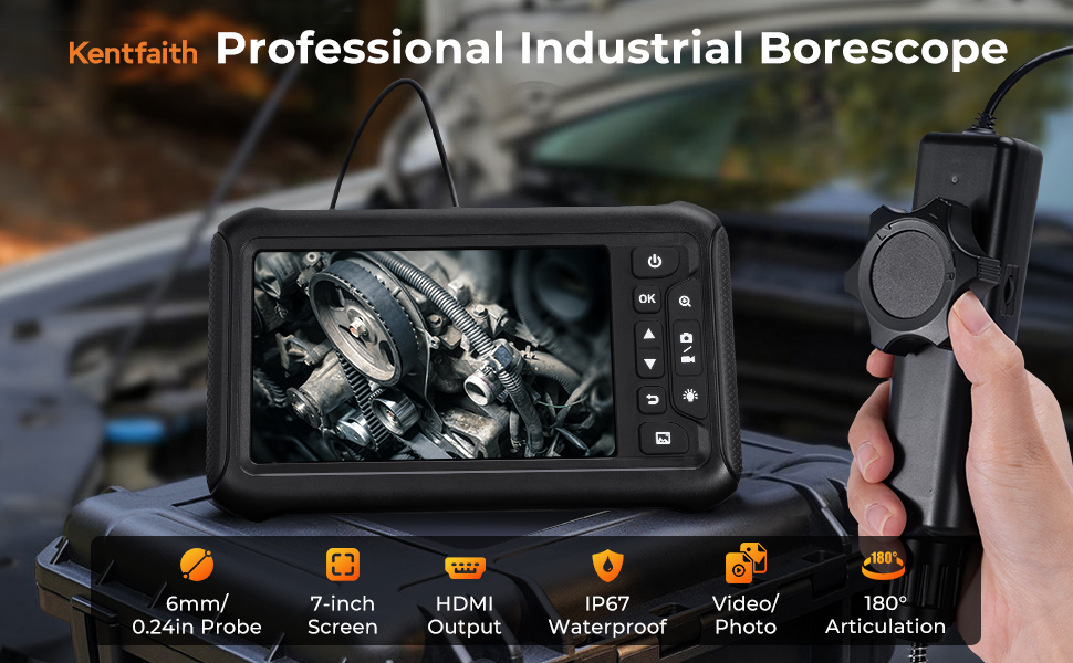 6мм инспекционная камера, с 180° двухсторонней артикуляцией, выходом HDMI, 7-дюймовым экраном, аккумулятором 8000mAh, видео и фото 1080P, Kentfaith