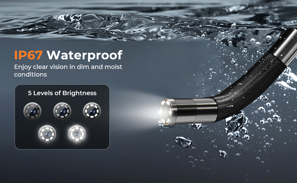 Созданный для работы в полевых условиях, зонд и кабель имеют степень защиты IP67, что делает их полностью водонепроницаемыми и устойчивыми к маслу и пыли. С 5-уровневой яркостью вы можете уверенно проверять заполненные жидкостью линии или загрязнённые среды без риска повреждения.